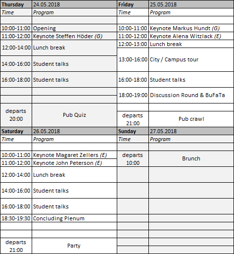 The core of every StuTs are the studential presentations and the keynotes of the professors of course! But we will come up with a lot more! We have planned a guided tour around our beautiful seaside city, a trip to the beach (unless Kiel decides to present you its ‘favourite weather’ which contains lots of water from above…), the famous final party, workshops, seagulls and a lot more!